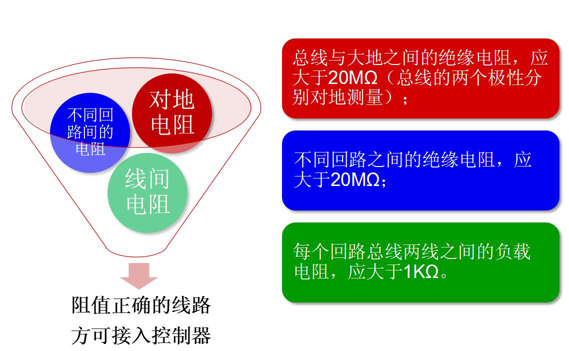 火災(zāi)自動(dòng)報(bào)警系統(tǒng)導(dǎo)線敷設(shè)后,在安裝現(xiàn)場(chǎng)設(shè)備之前,應(yīng)對(duì)每回路的導(dǎo)線用500V的兆歐表(搖表)測(cè)量絕緣電阻,其對(duì)地絕緣電阻值不應(yīng)小于20MΩ。接好設(shè)備后,用萬(wàn)用表的歐姆檔檢查線間是否短路,阻值是否正常(大于1KΩ),線路是否接地(大于20MΩ)。有以上故障應(yīng)及時(shí)處理。