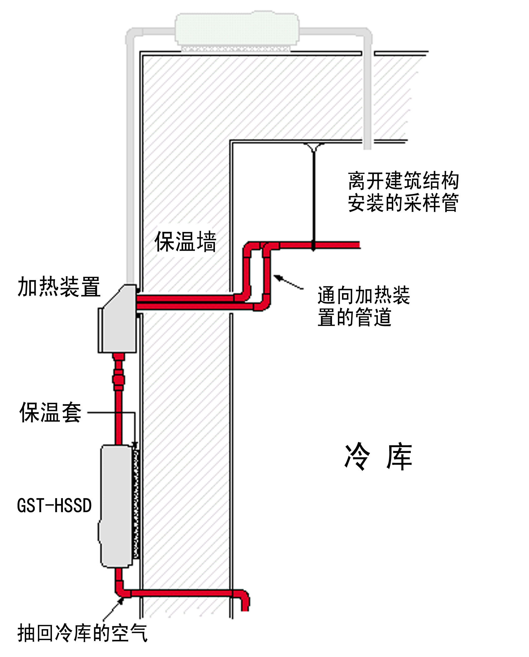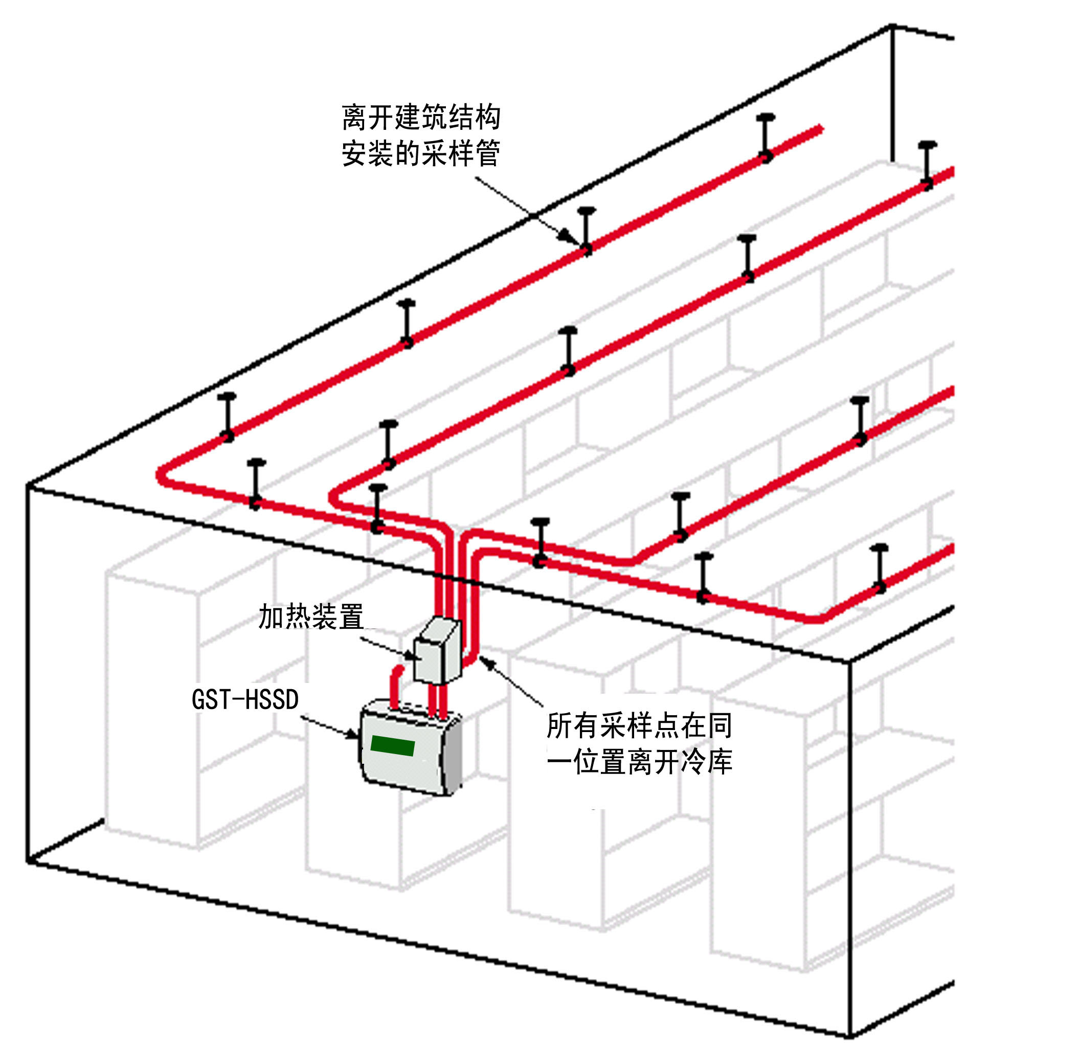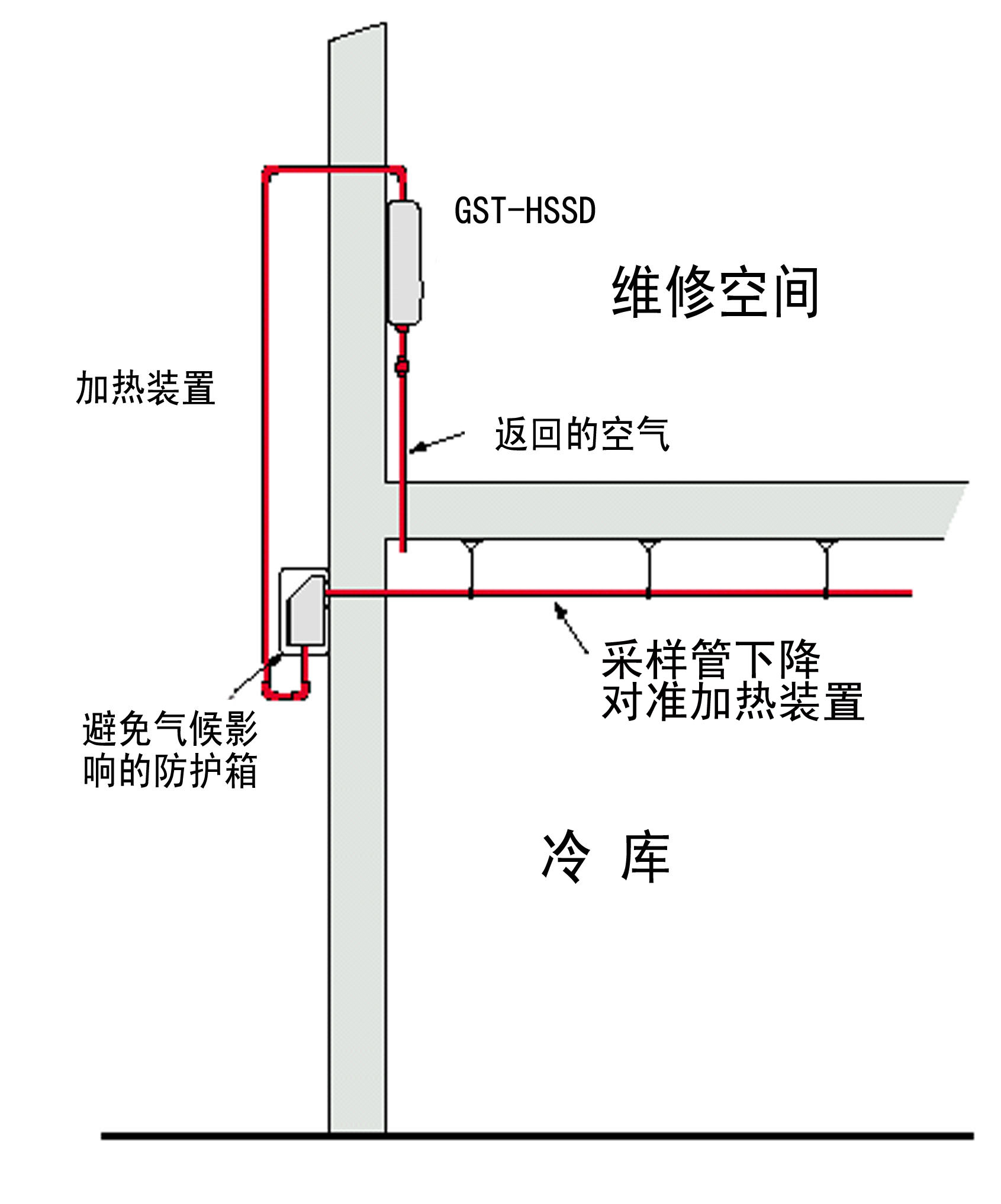 冷庫中采樣管,加熱箱和吸氣式感煙火災(zāi)探測器的相對位置