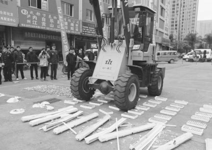 “銷毀!”3月14日上午9點(diǎn)半,在成都市金府機(jī)電城的廣場上,消火栓箱、防火門、排煙防火閥、消防水槍、灑水噴頭等消防產(chǎn)品擺了一地,但是和正規(guī)產(chǎn)品不同,現(xiàn)場的這8類消防產(chǎn)品,都是偷工減料的偽劣品。