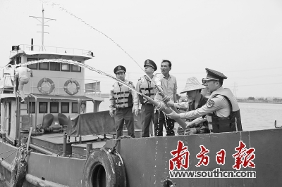 廣東汕頭邊防官兵與義務(wù)消防船上的員工一同演練滅火。劉建高 攝